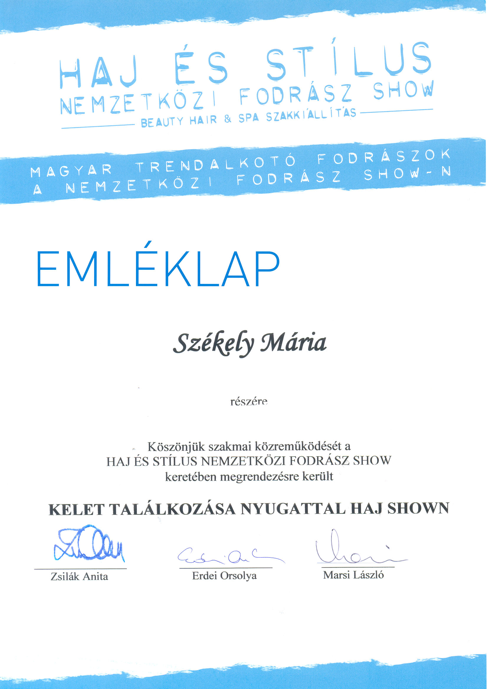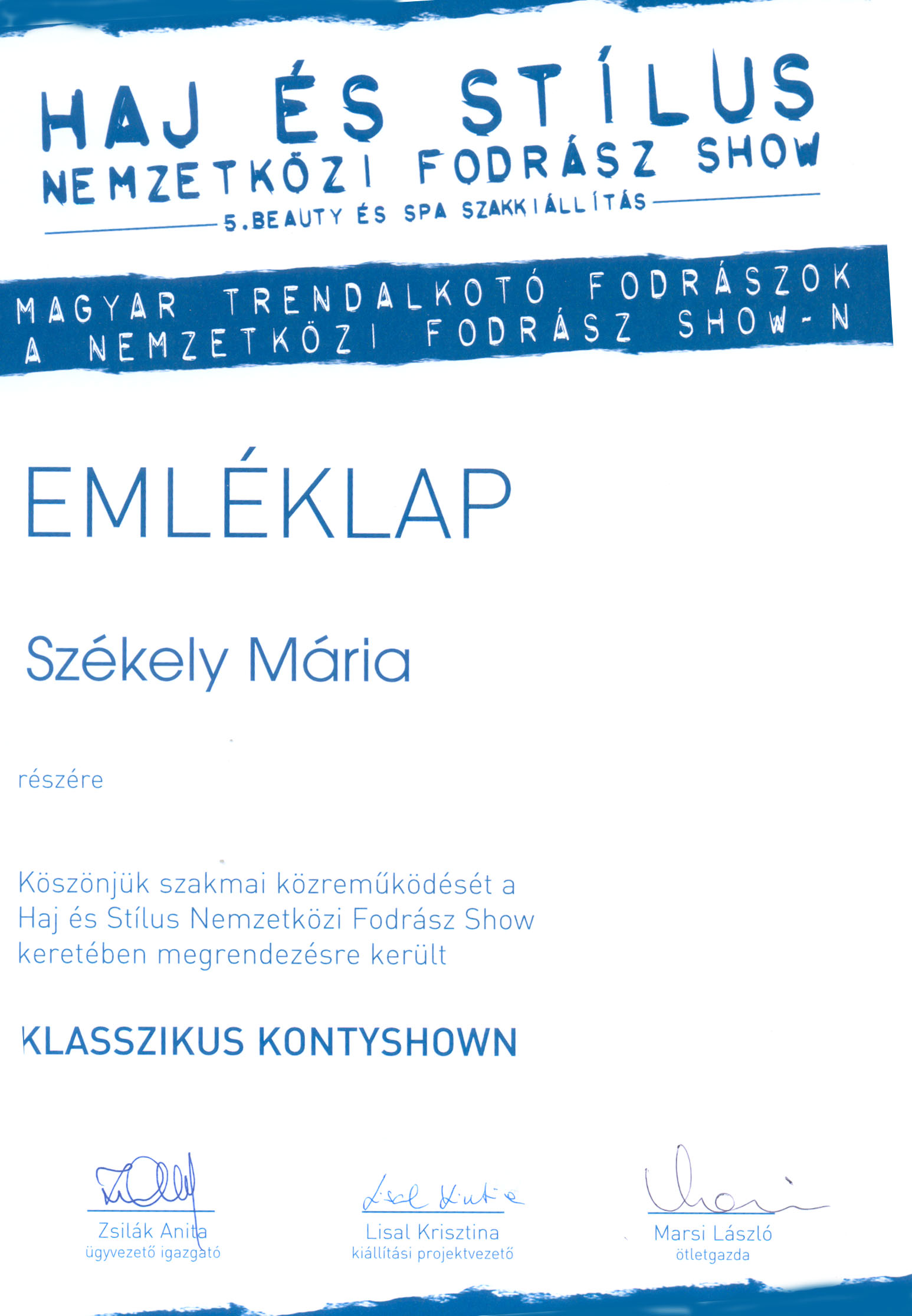 - Haj és Stílus Nemzetközi Fodrász Show , 2010. - díjazott frizuránk